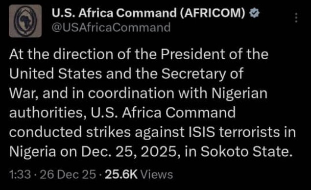 On its part, the United States Africa Command (AFRICOM) confirmed that the airstrike targeted identified elements of the Islamic State (ISIS) in northwest Nigeria at the request of Nigerian authorities, describing the action as part of ongoing efforts to degrade extremist activity in the region.